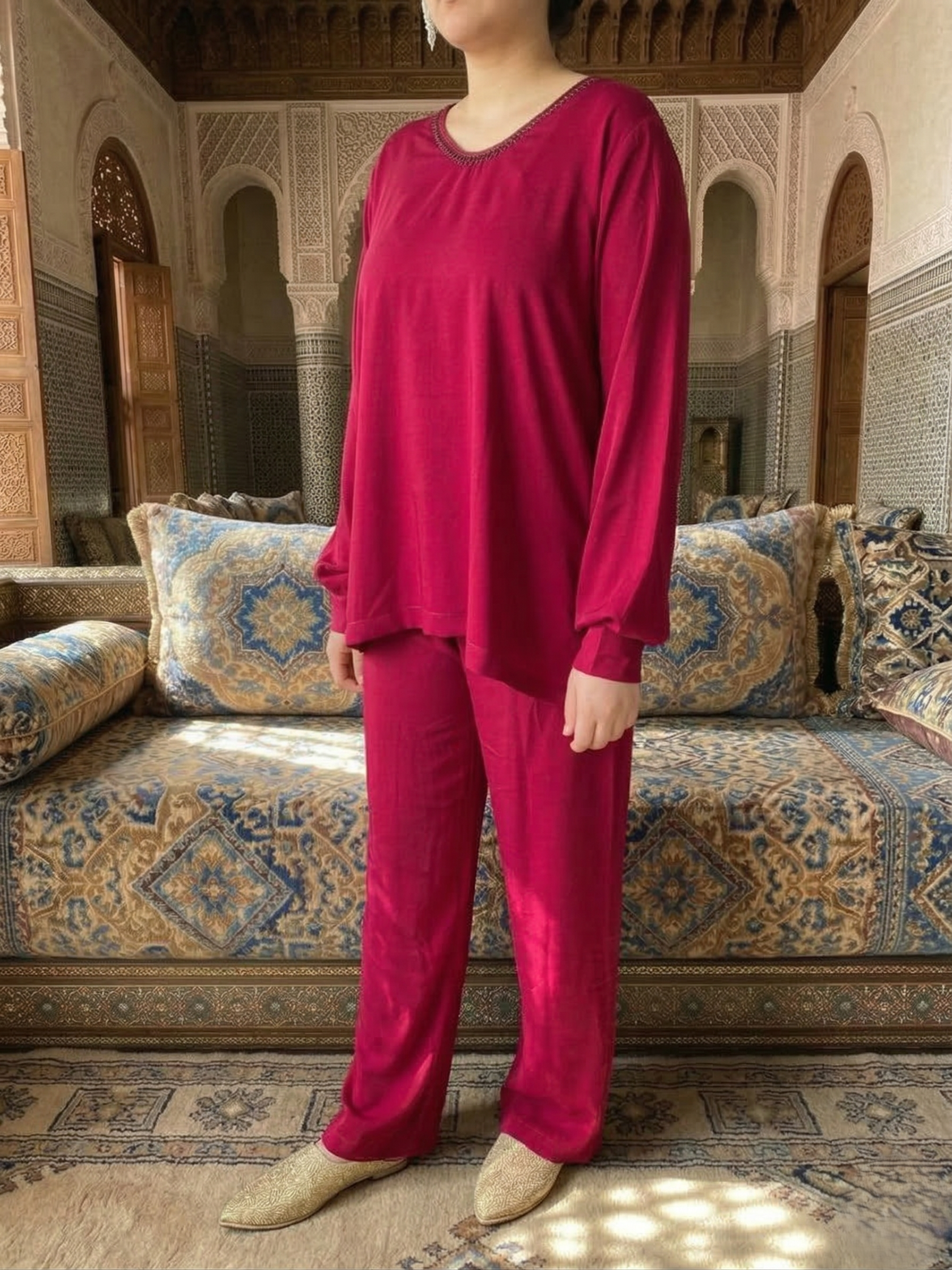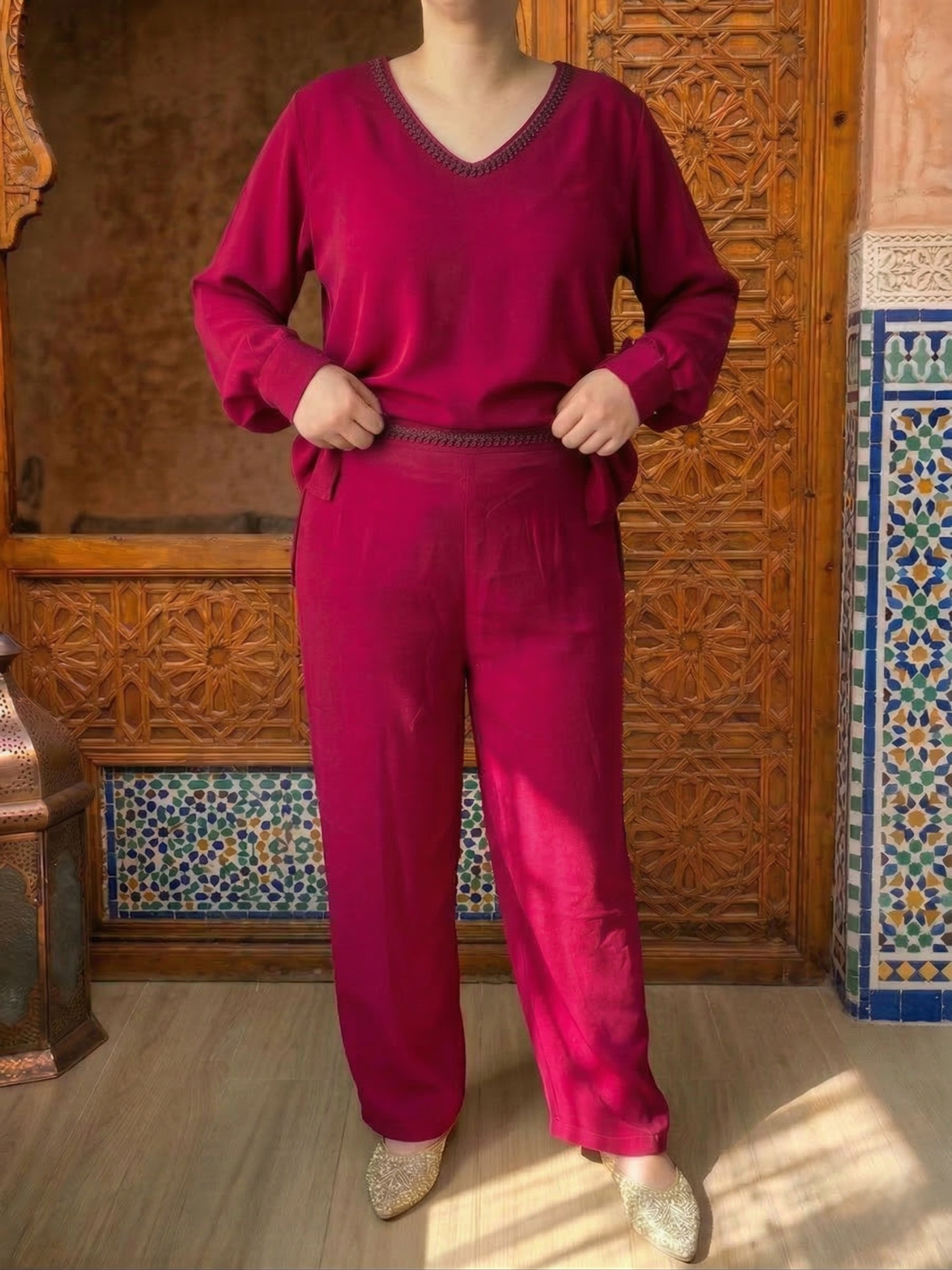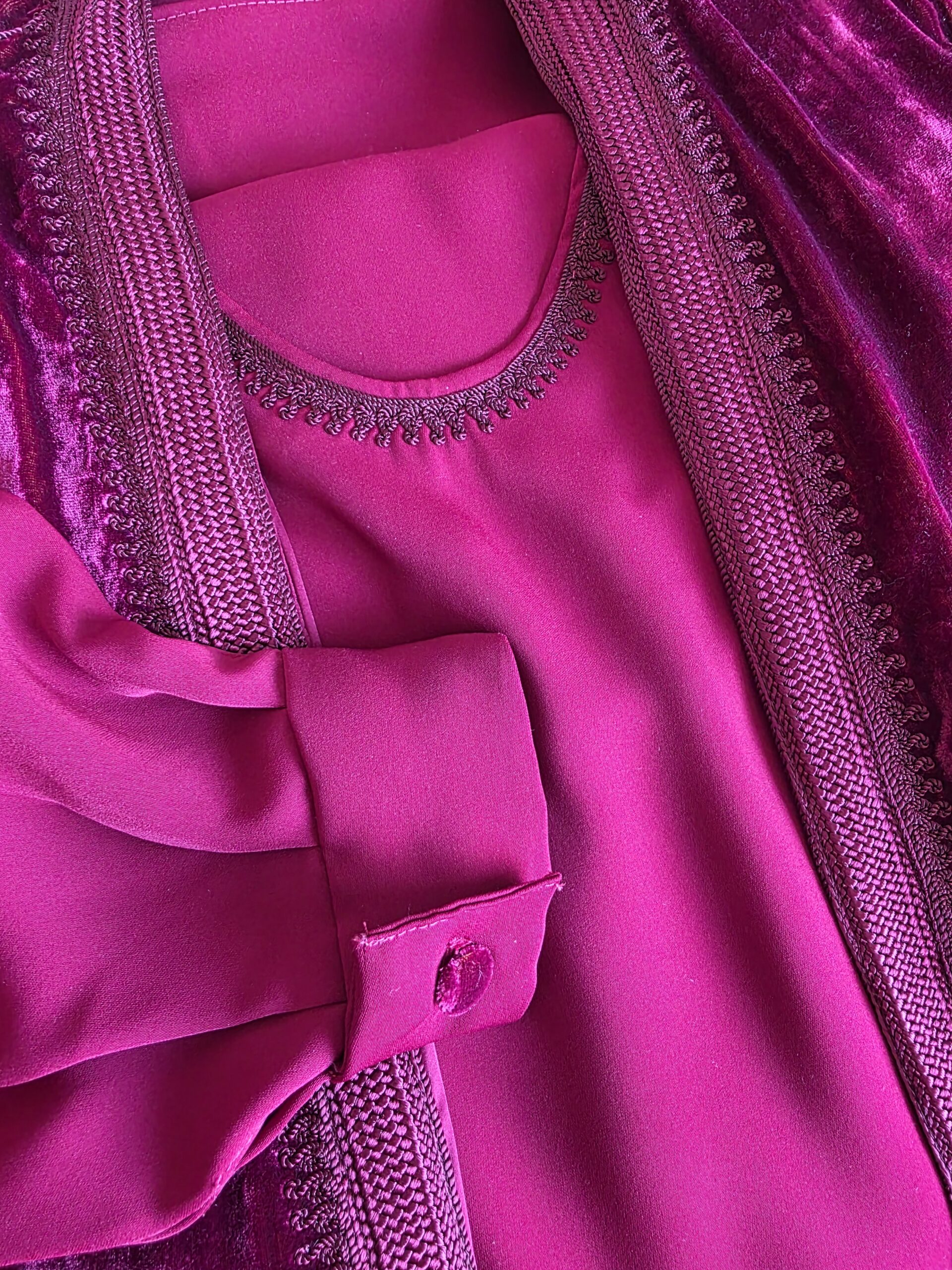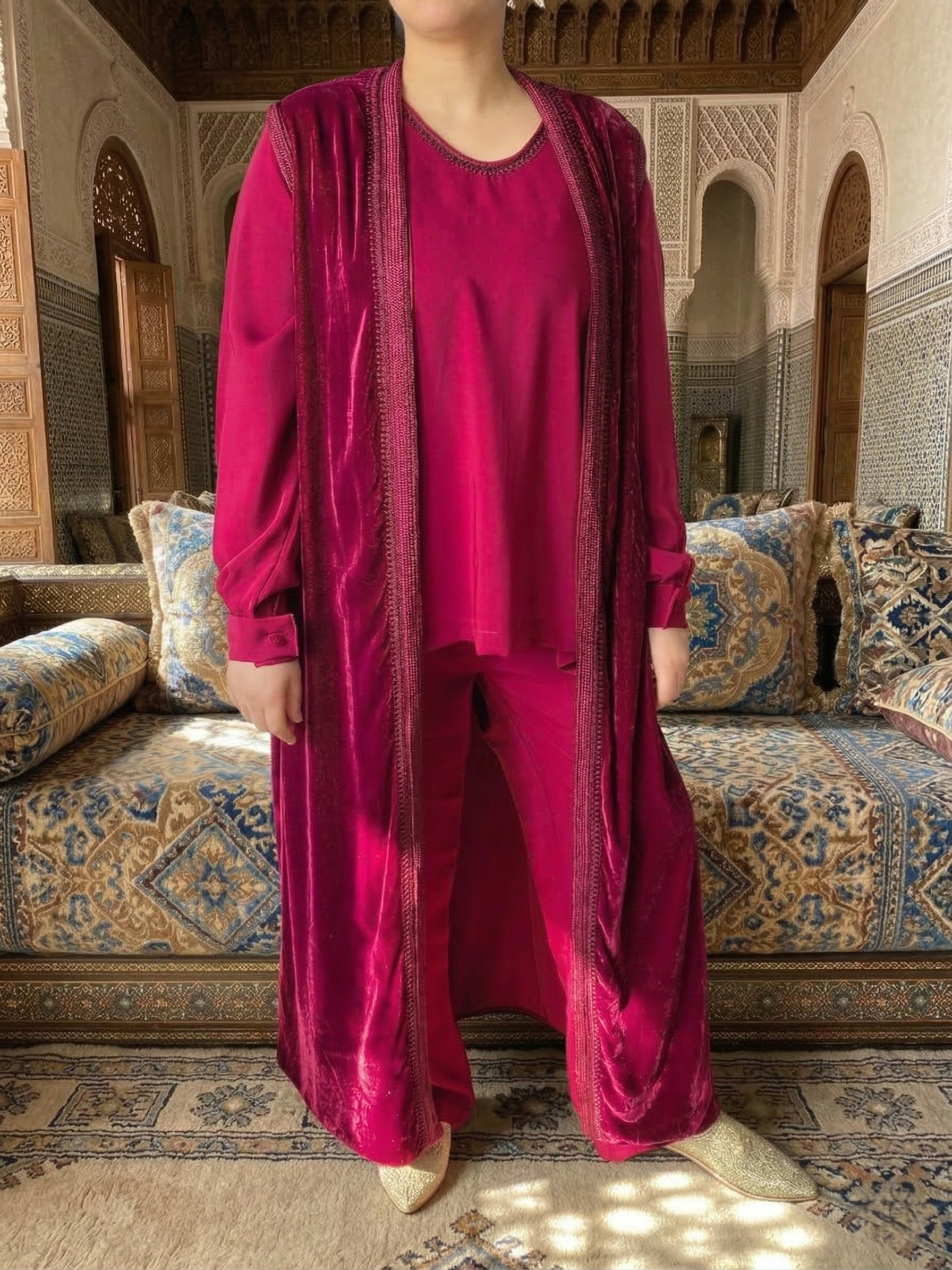 Una nuova, vibrante interpretazione del Kimono Asil, declinata in una profonda tonalità amaranto. Questo completo 3 pezzi unisce il lusso del velluto con la raffinatezza di dettagli artigianali unici, perfetti per chi desidera una presenza scenica ma discreta. La combinazione di texture crea un gioco di luci che enfatizza la silhouette.