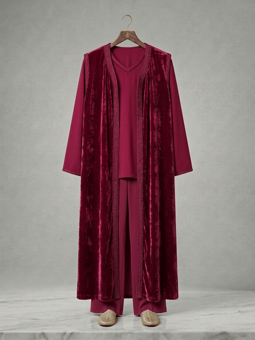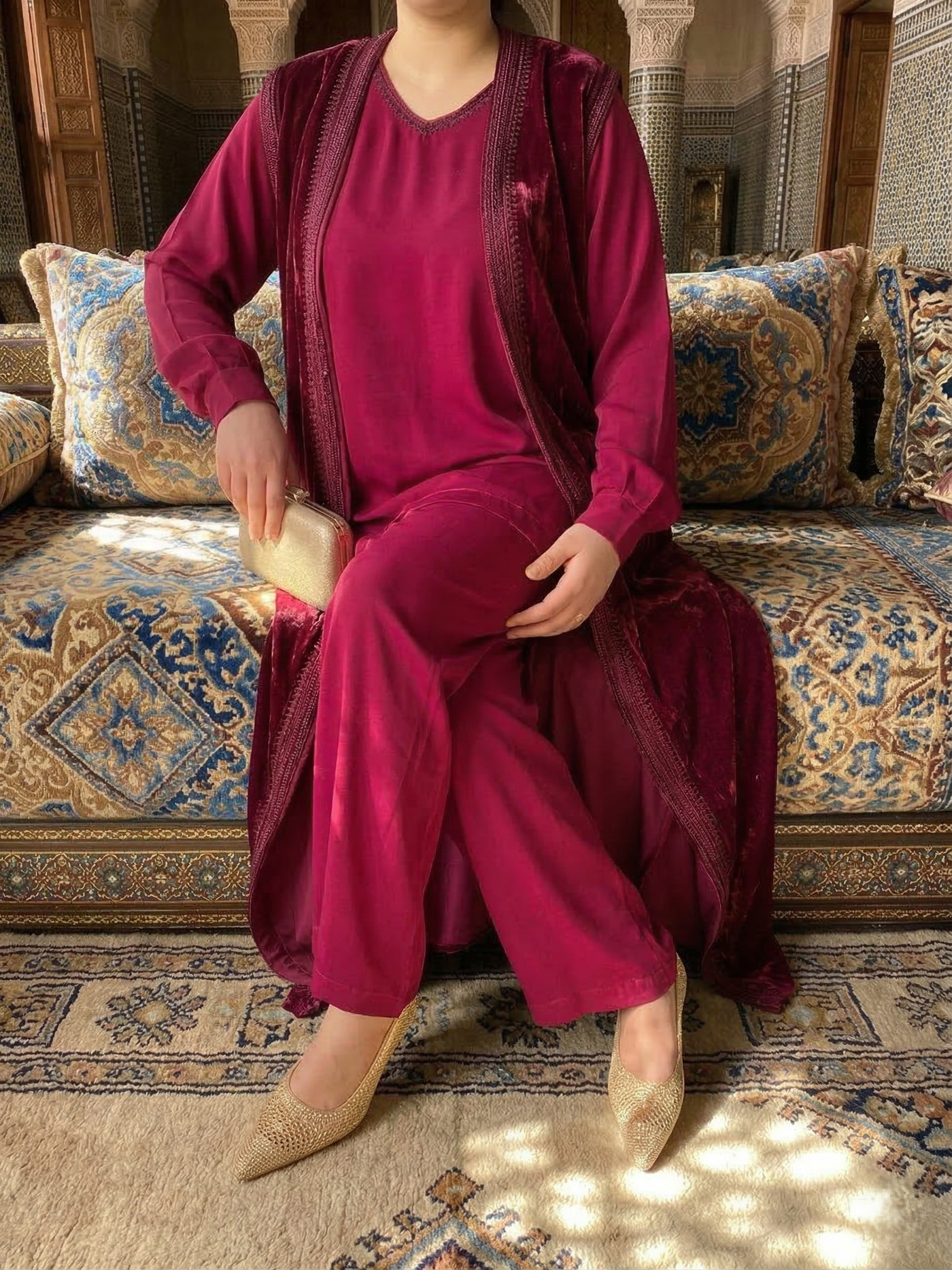 Una nuova, vibrante interpretazione del kimono Asil, declinata in una profonda tonalità amaranto. Questo completo 3 pezzi unisce il lusso del velluto con la raffinatezza di dettagli artigianali unici, perfetti per chi desidera una presenza scenica ma discreta. La combinazione di texture crea un gioco di luci che enfatizza la silhouette.