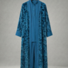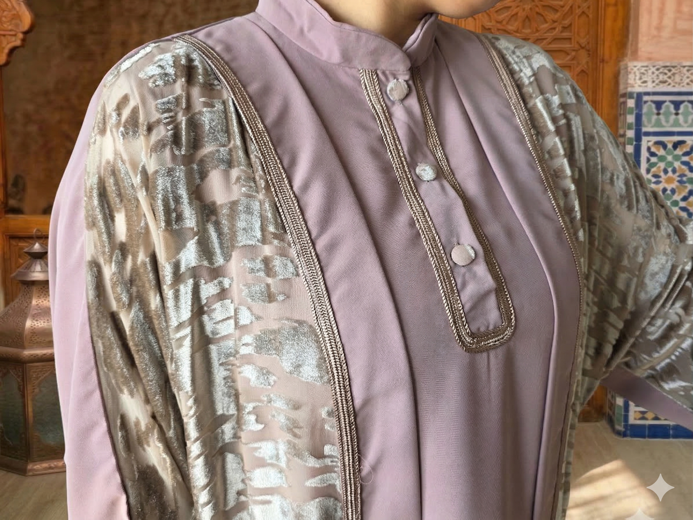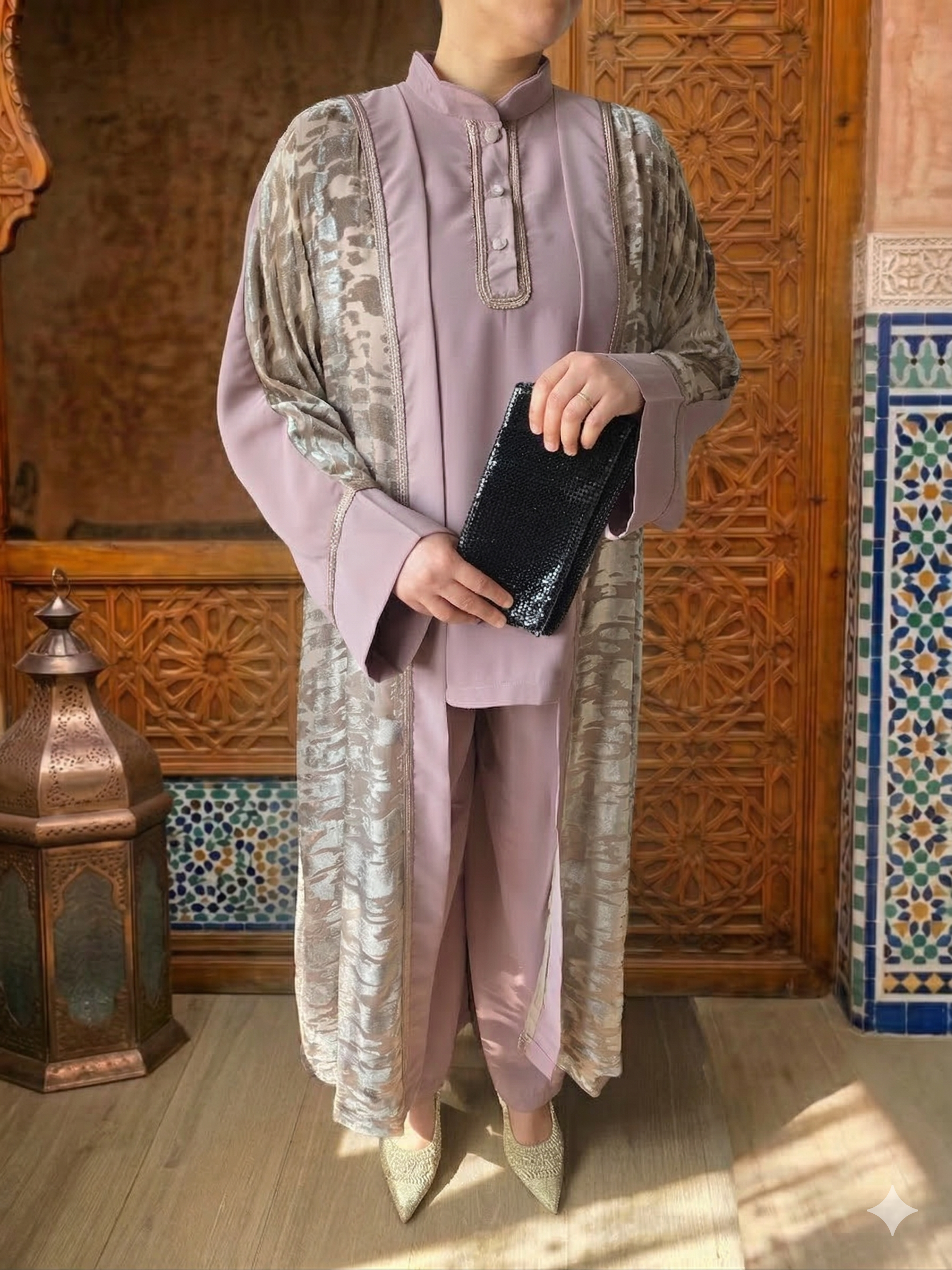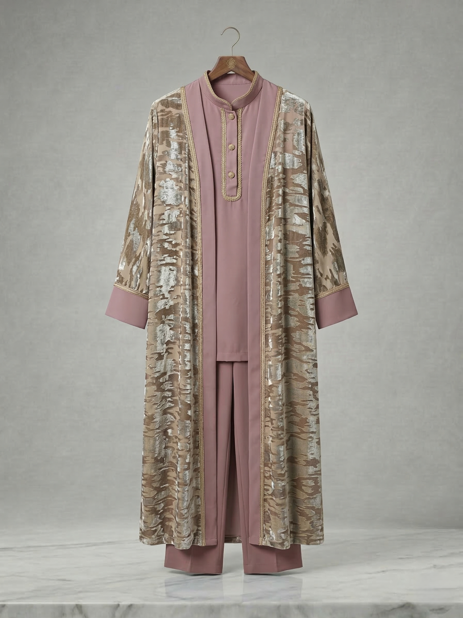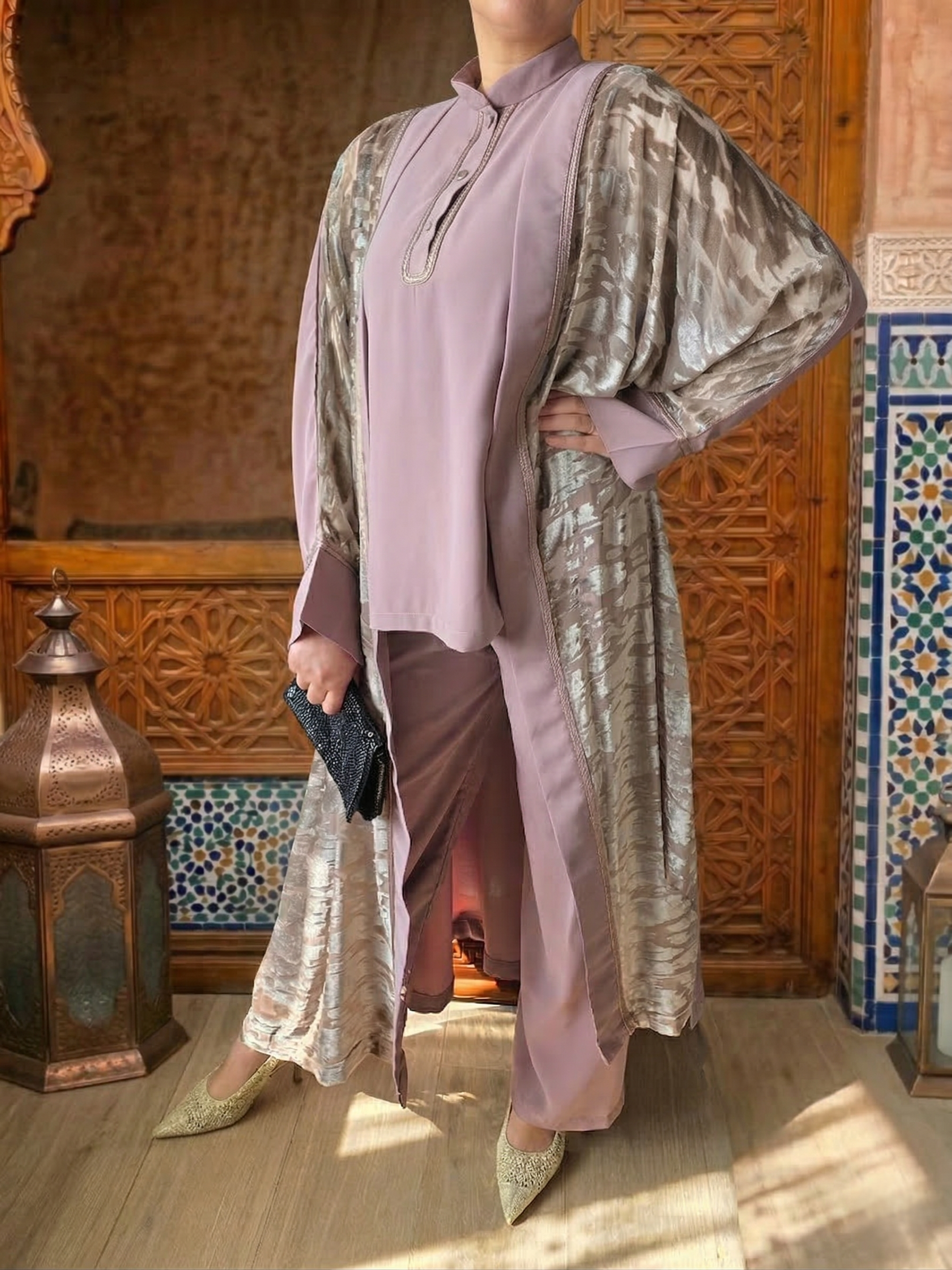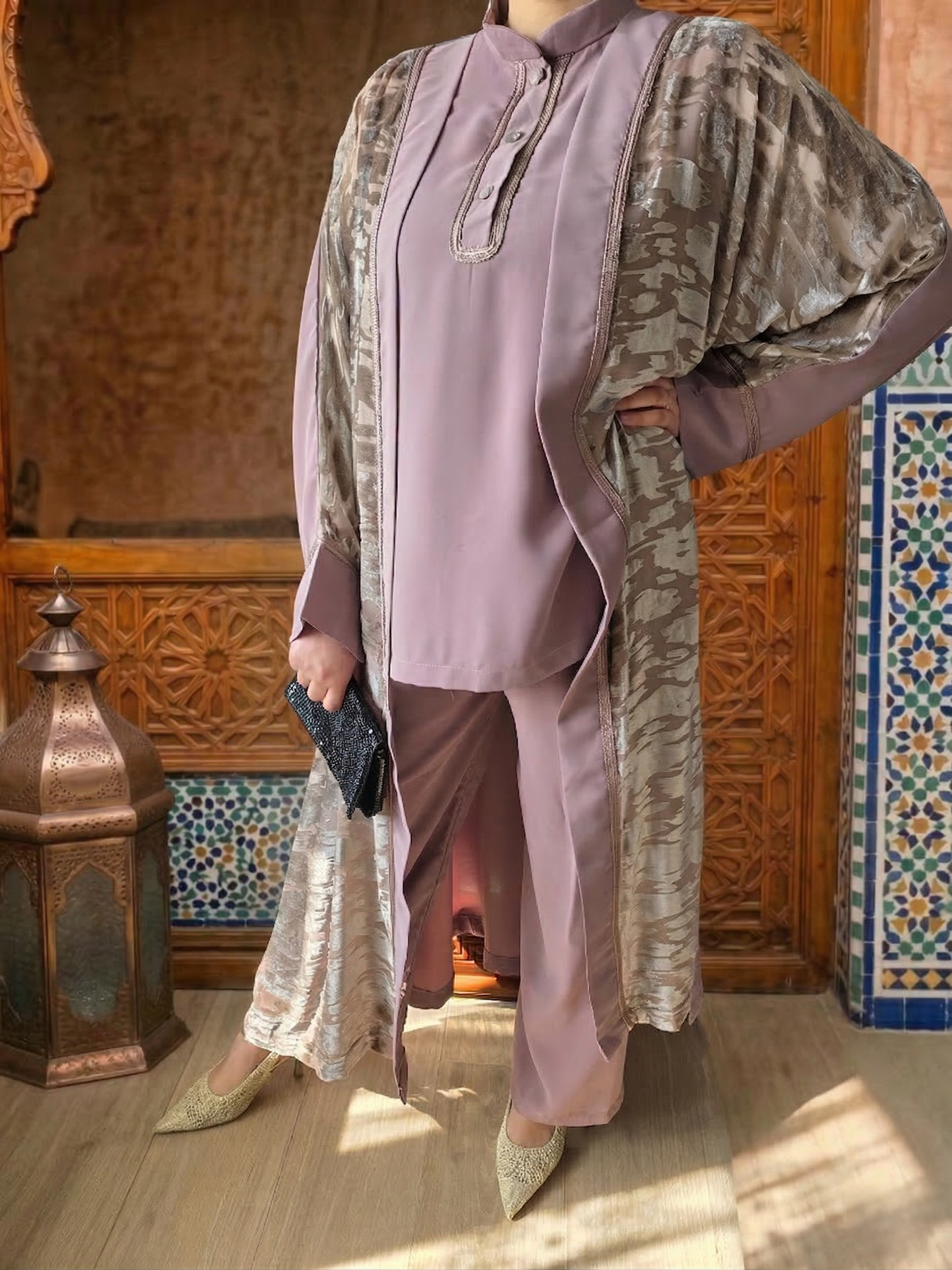 Kaftano (Kimono) in Velluto: Un capo spalla d’effetto, realizzato in tessuto leggero con una raffinata lavorazione in velluto a rilievo. Le venature dorate su base rosa antico creano riflessi cangianti che impreziosiscono l’intera figura.