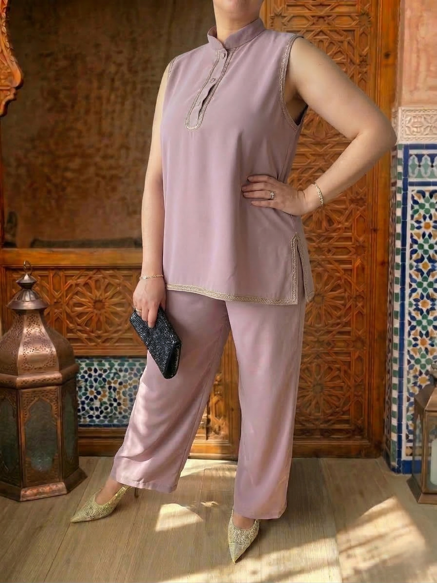 L’equilibrio perfetto tra il fascino dell’artigianato e lo stile contemporaneo. Il Modello Batul nella nuance Rosa Antico è un set tre-pezzi pensato per la donna che desidera un outfit esclusivo, luminoso e incredibilmente versatile.