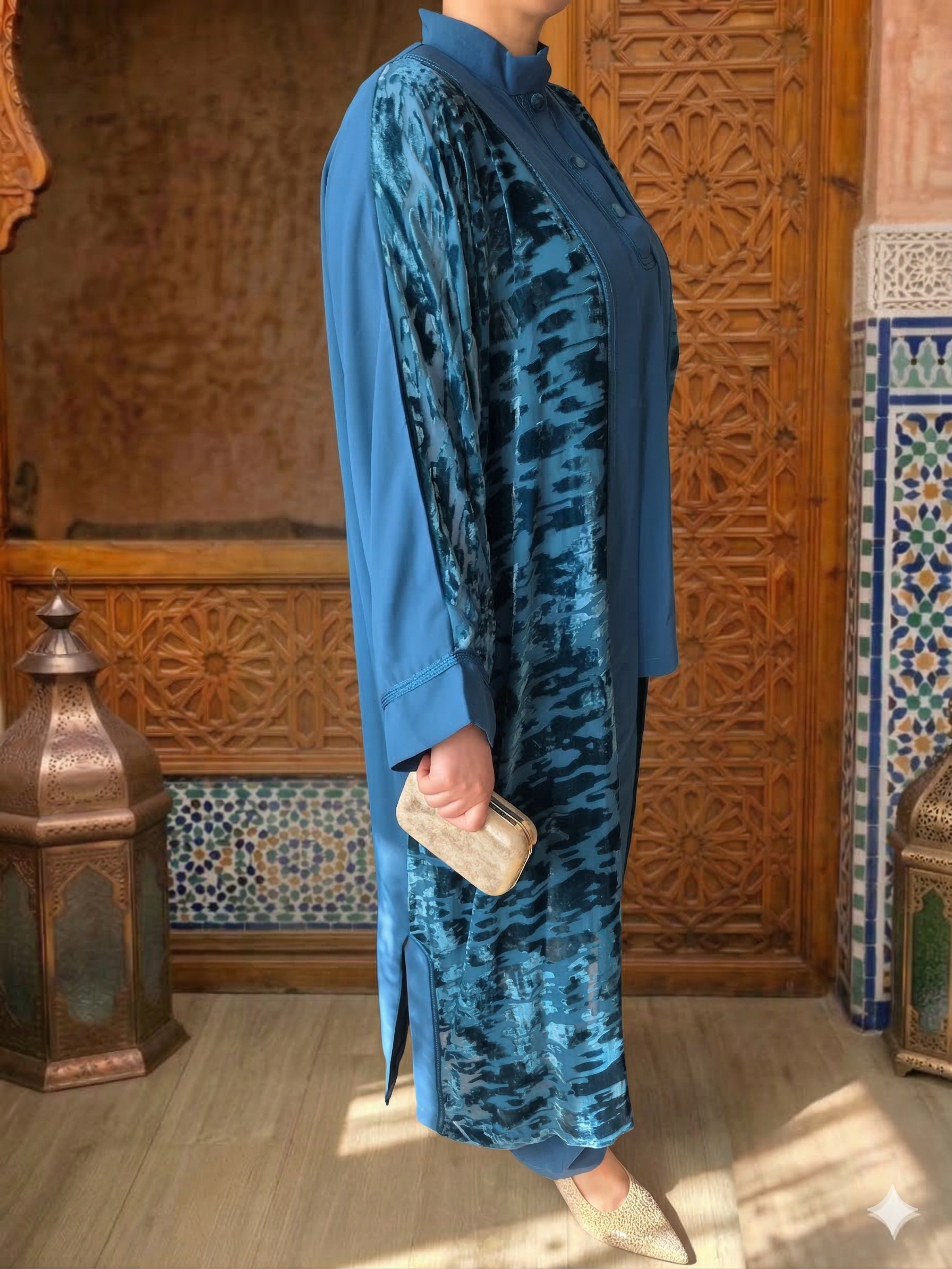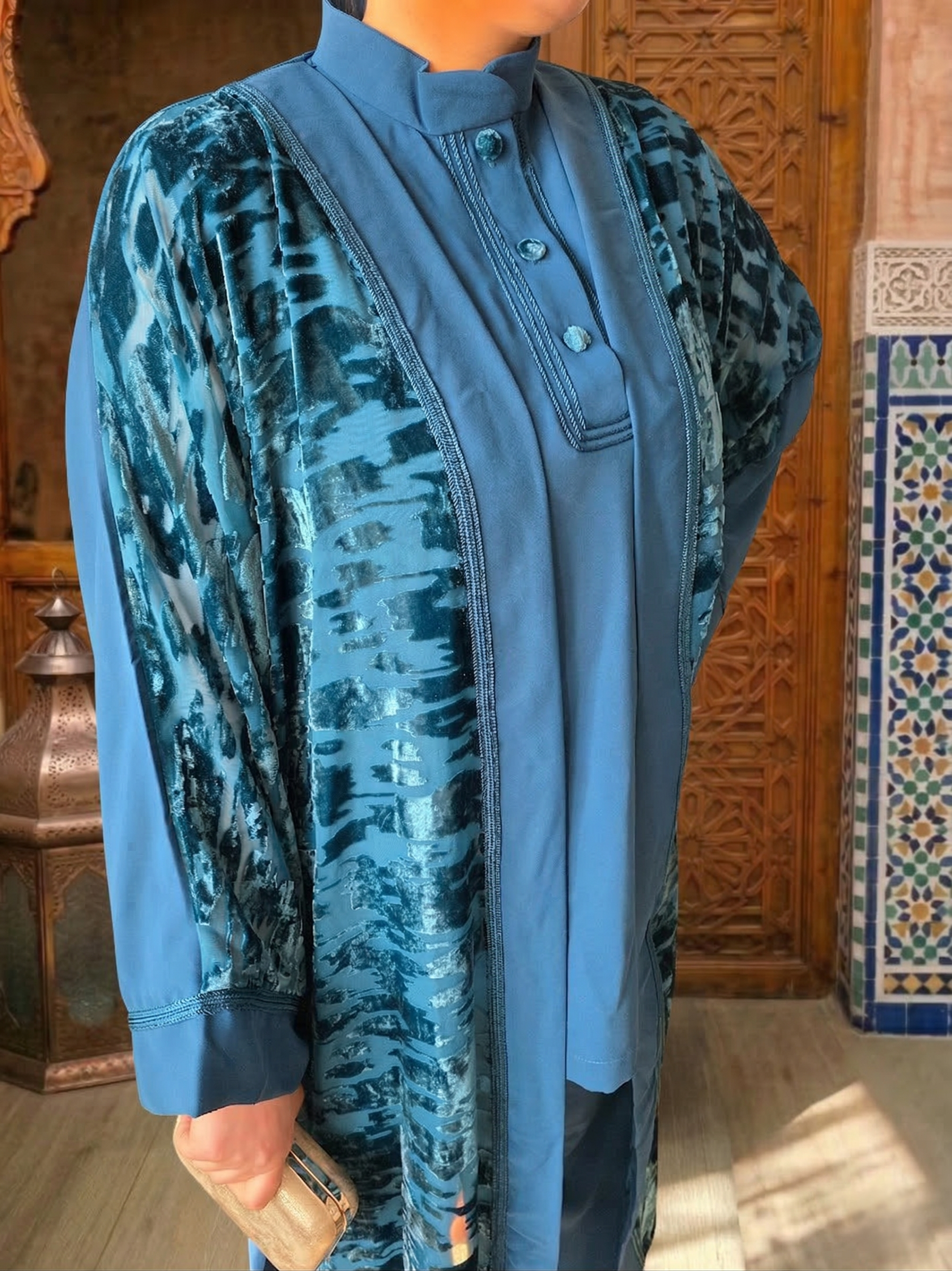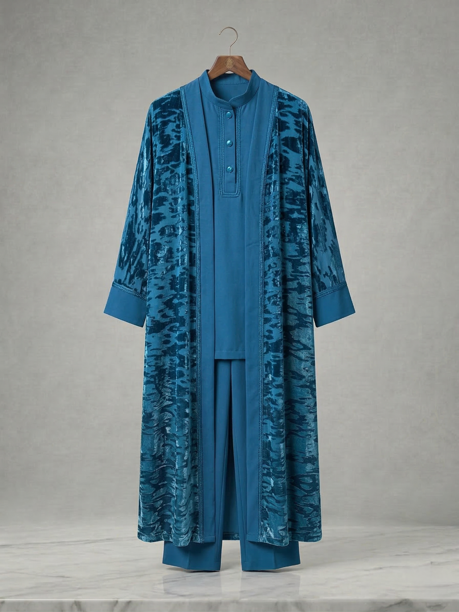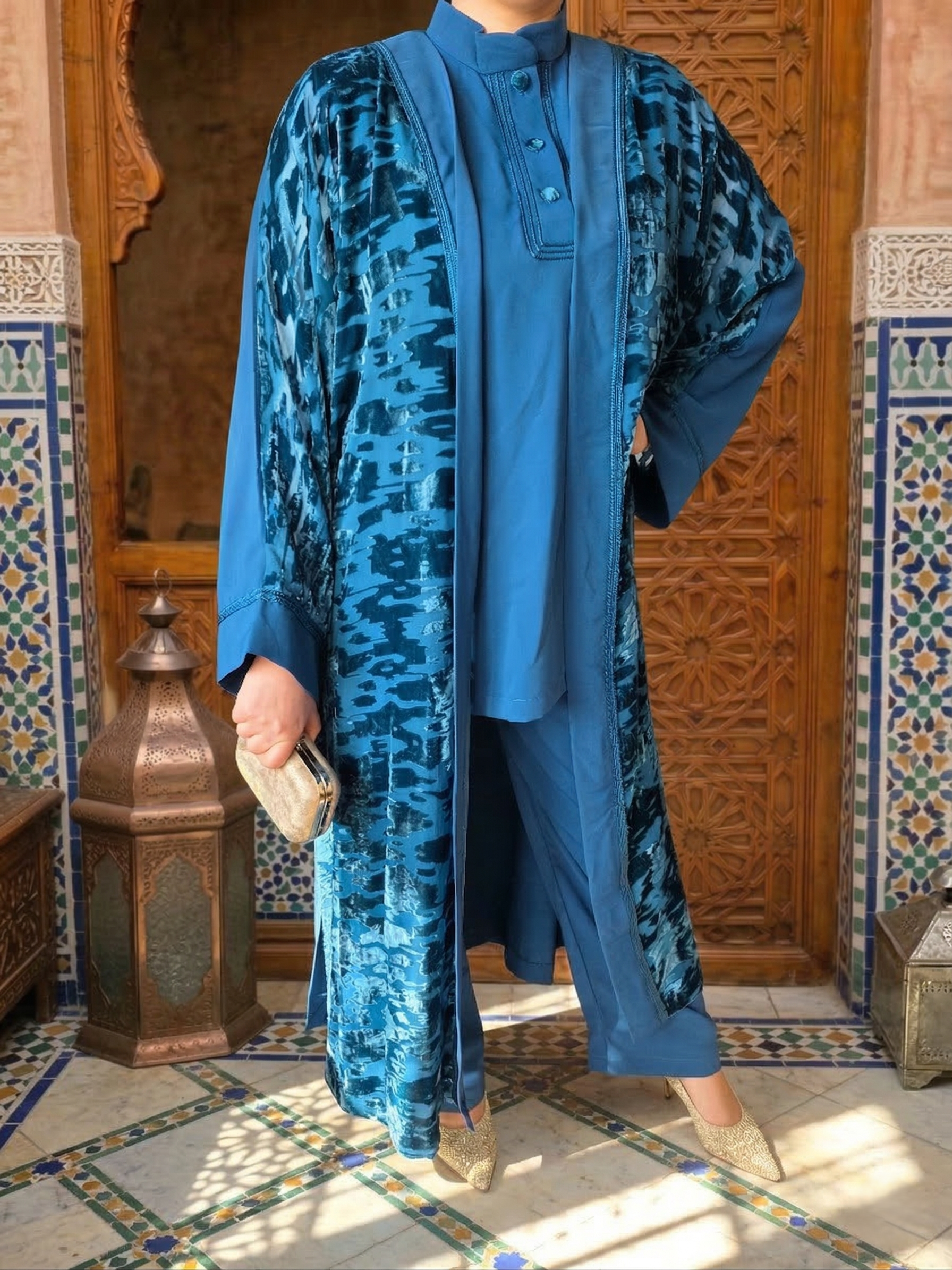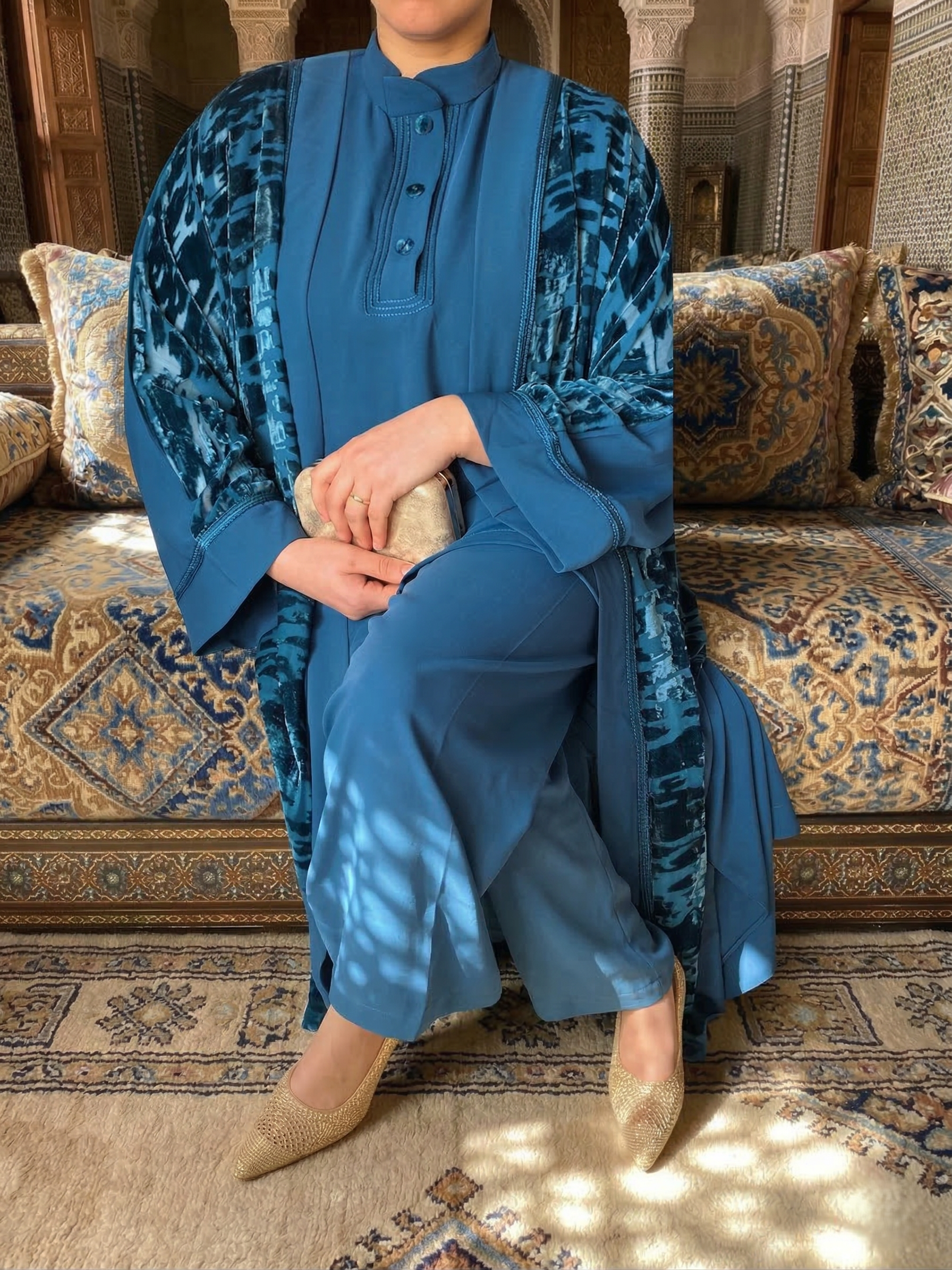 Kaftano (Kimono) in Velluto Devoré: Il pezzo forte del set. Il tessuto presenta una lavorazione a rilievo in velluto tono su tono che crea un effetto tridimensionale. La base semitrasparente contrasta con la lucentezza del velluto, rendendo il capo fluido e lussuoso.