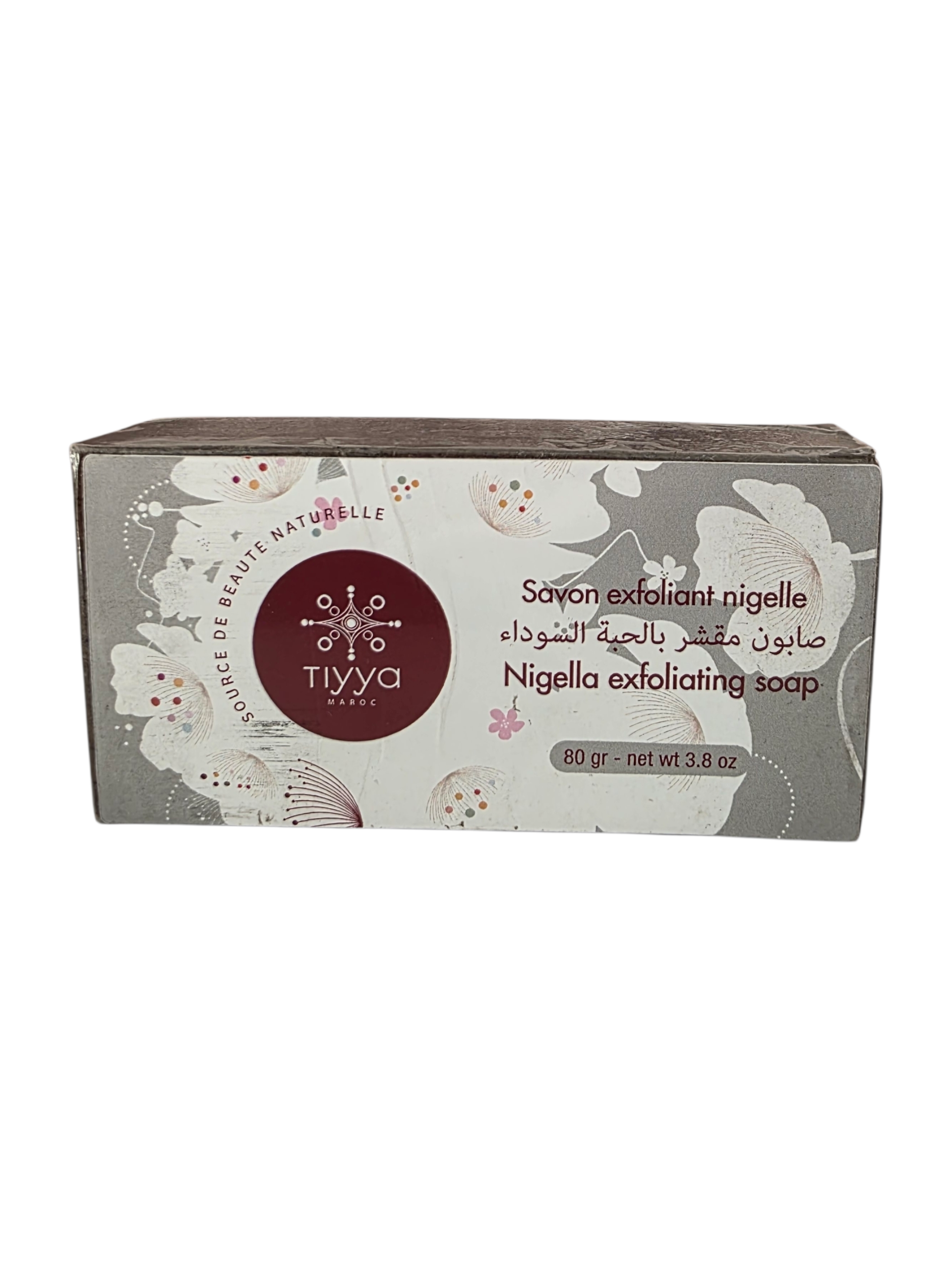 Il sapone esfoliante alla nigella di Tiyya Maroc è un trattamento purificante profondo che attinge ai segreti della bellezza naturale del Marocco. Conosciuta come “l’oro nero dei faraoni”, la nigella (cumino nero) offre proprietà rigeneranti uniche.