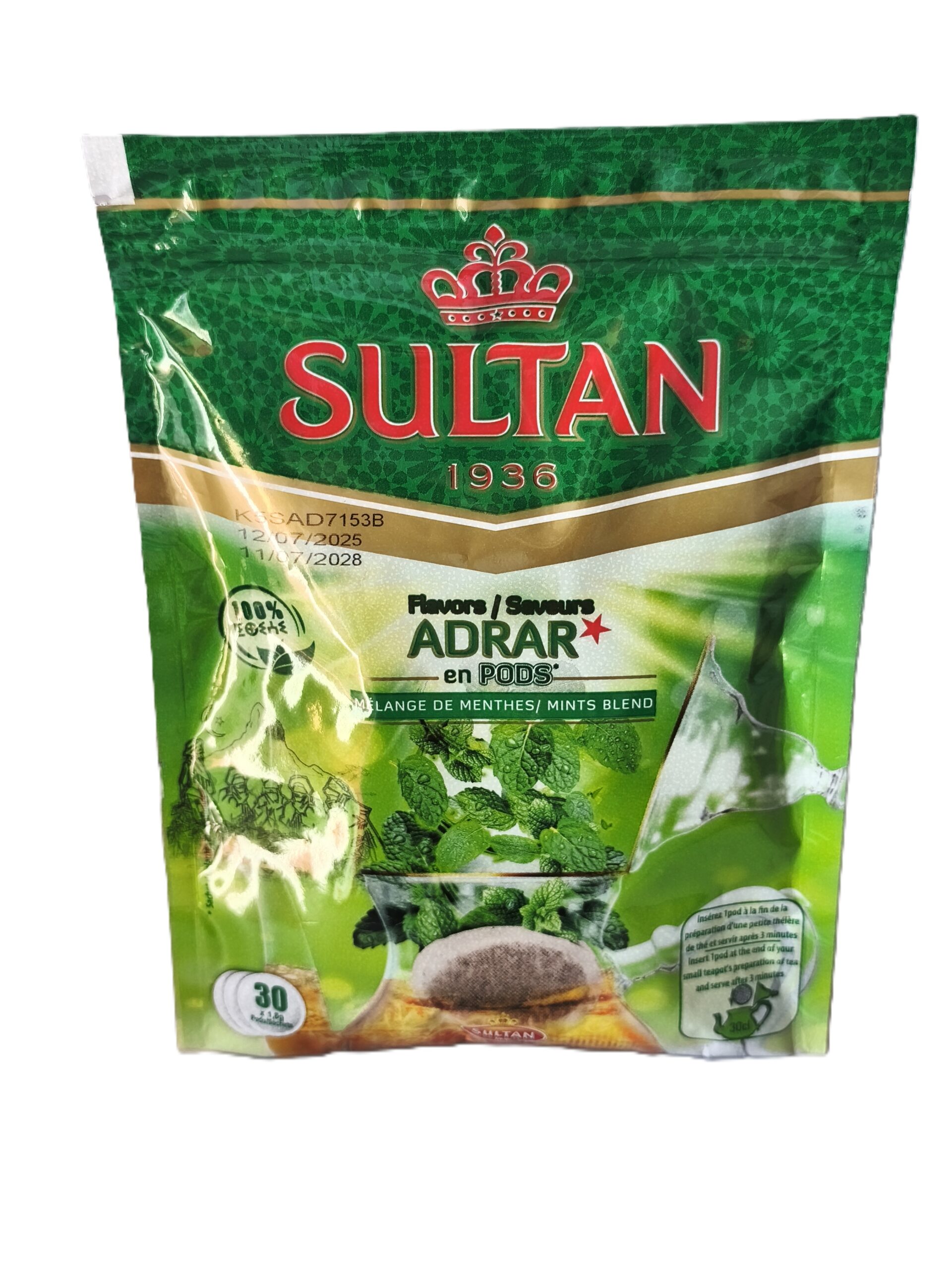 Tè Sultan, “Marrakech” o “Adrar”, è un marchio storico e rinomato per le sue miscele marocchine.  Il Sultan Adrar è una miscela esclusiva di erbe aromatiche che racchiude i profumi della tradizione marocchina in un formato pratico e moderno. Pensato per chi ama le note fresche e balsamiche, questo infuso offre un viaggio sensoriale immediato tra i giardini di Marrakech.